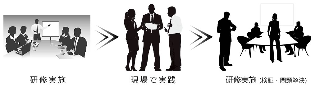 研修の時だけ学んで理解しても、現場で活用されなければ全く意味がありません。 現場に合わせた「課題」や「行動計画」を持ち帰ってもらい、現場で生かして頂くことで、実際の成果 につながります。 もし現場で生かせなかった場合は何が原因で成功しなかったのか、何故実施できなかったのかを次 回の研修で検証し修正いたします。